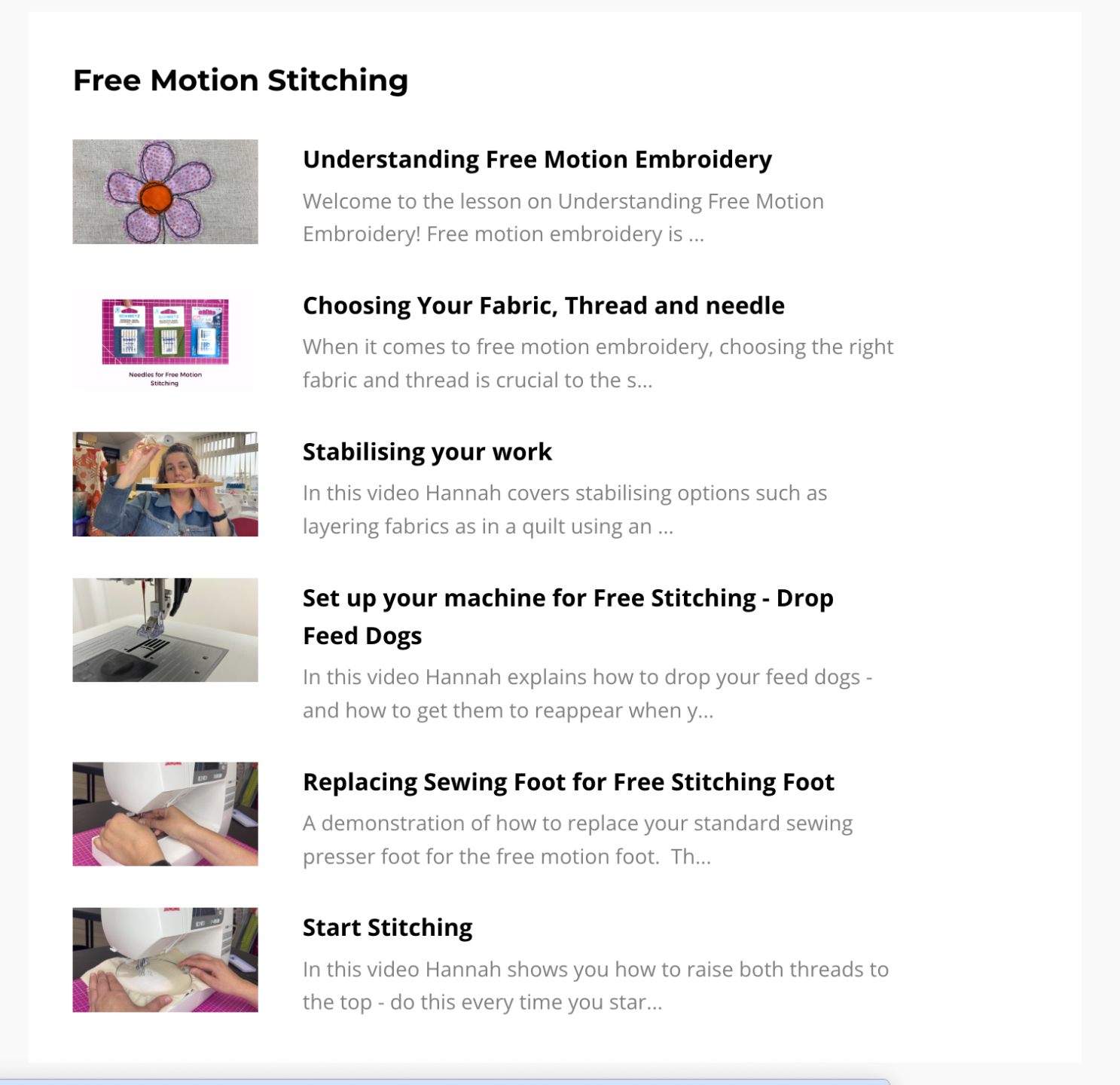 - A series of videos giving you lots of information about how to get started with free motion stitching on your domestic sewing machine